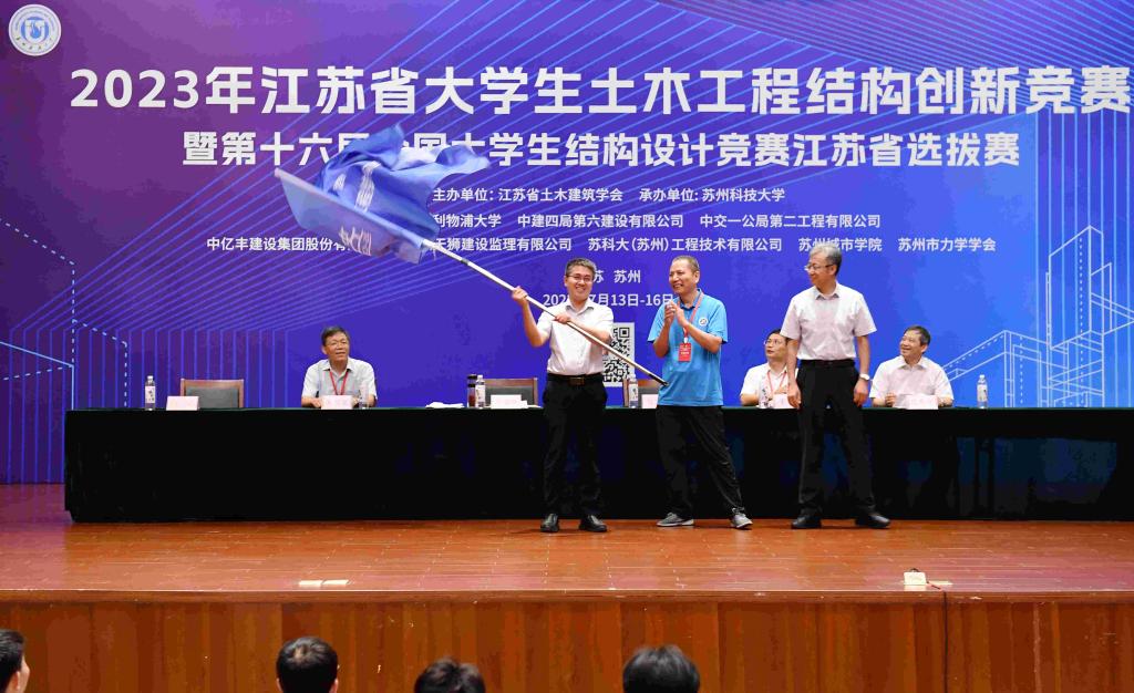 获奖名单宣读后进行了颁奖仪式,最后由江苏省土木建筑学会教育工作委员会副主任委员吕恒林对本次竞赛进行了总结并主持了会旗交接仪式。吕恒林表示,本届大赛充分展现了新时代大学生的创新意识和结构设计的精彩魅力,并向获奖师生表示热烈祝贺,向各位专家和全体工作人员表示诚挚谢意。随后,吕恒林教授将赛旗交予下一届承办单位常州大学,常州大学城市建设探花社区 副院长王新杰接旗。