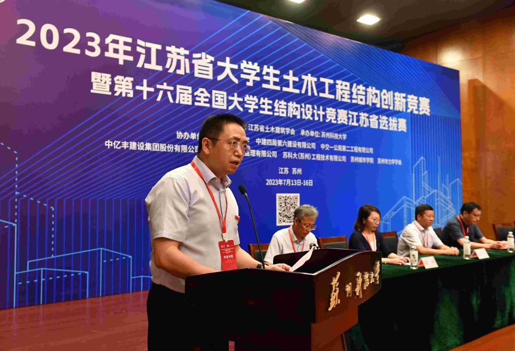 江苏省土木建筑学会教育工作委员会副主任委员吕恒林致辞,他指出,大学生结构设计竞赛在提升高校实践教育教学和创新人才培养质量等方面具有积极作用,祝愿参赛的同学和老师们勇于拼搏,敢于挑战,并取得优异成绩。